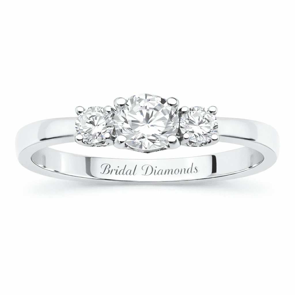 Celebrate your love story with this elegant three-stone 1 carat total lab-grown diamond engagement ring in 14K white gold. Designed to symbolize your past, present, and future together, this timeless engagement ring features three brilliant lab-created diamonds that deliver exceptional sparkle and fire. The classic three-stone setting enhances the center diamond while the side stones add extra brilliance for a balanced, luxurious look.