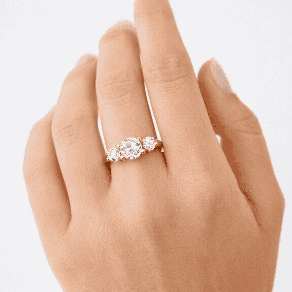 Perfect for proposals, anniversaries, or meaningful milestones, this three-stone engagement ring blends classic elegance with contemporary sustainability. Its refined design makes it ideal for everyday wear while remaining sophisticated enough for special occasions.